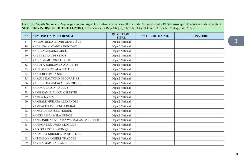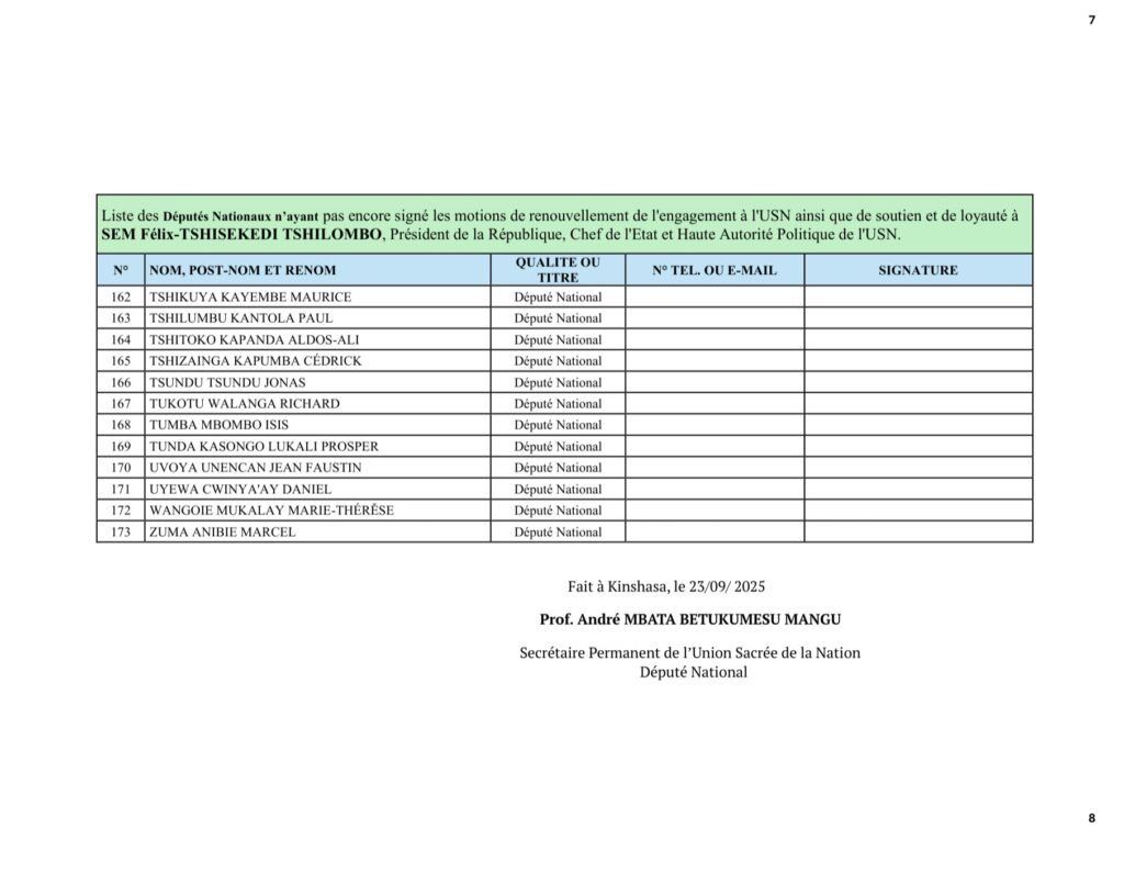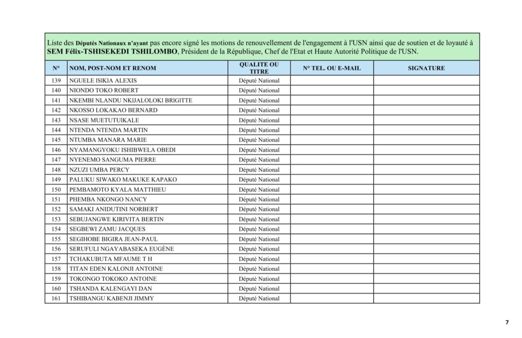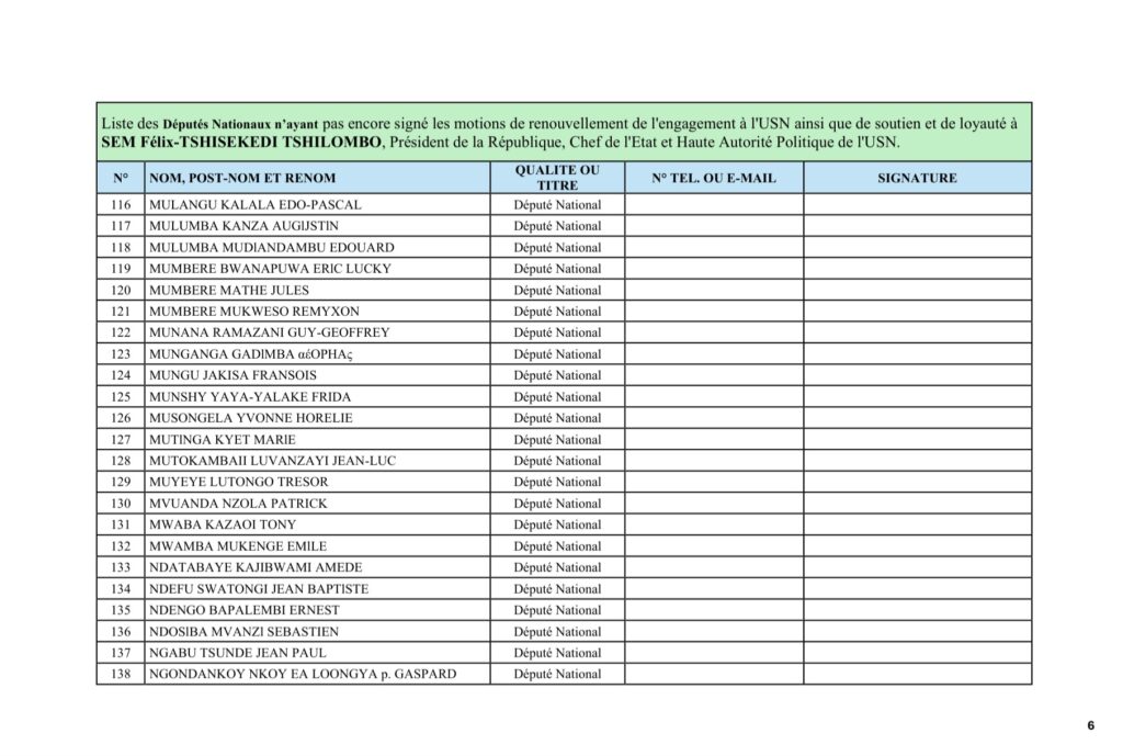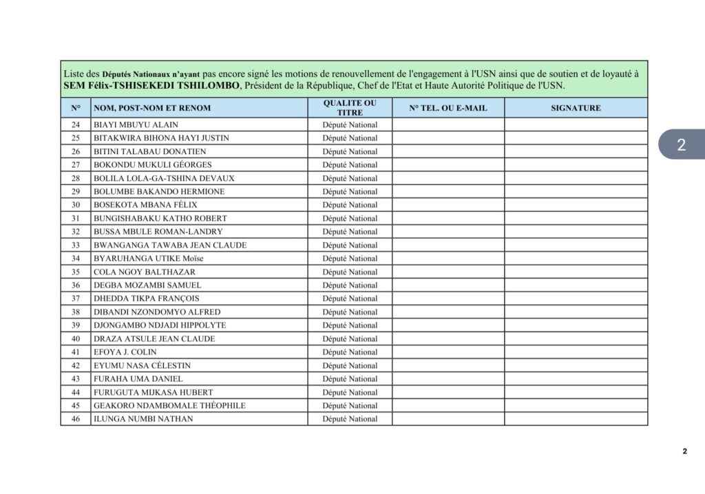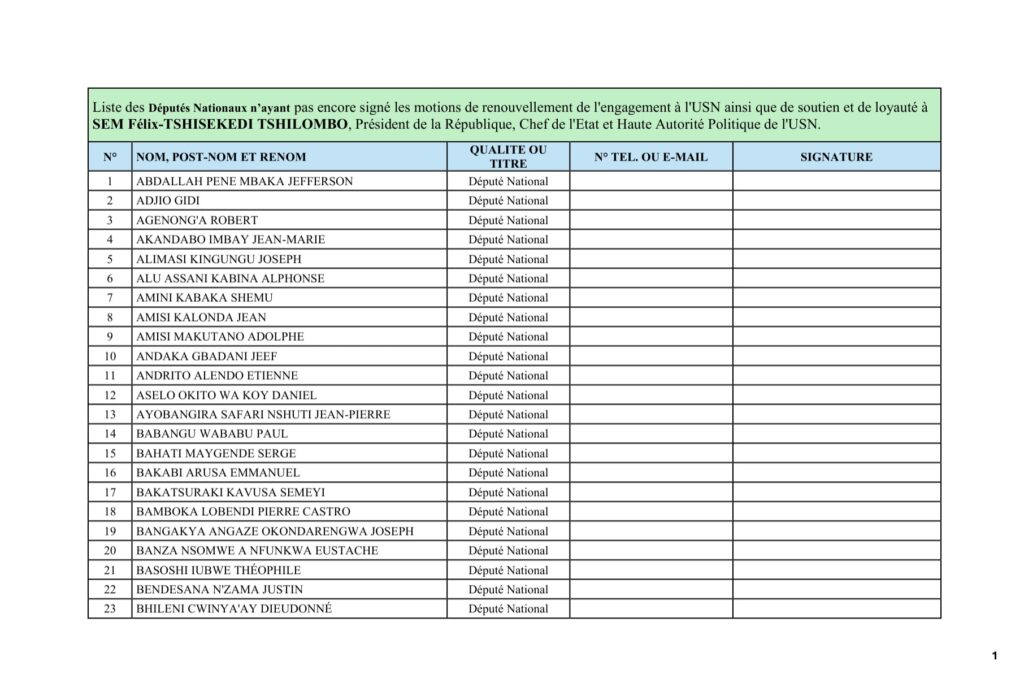 Le secrétaire général de l’Union sacrée de la Nation (USN) a dévoilé une liste comprenant 173 députés nationaux qui n’ont pas renouvelé leur loyauté envers le président Félix Tshisekedi. Cette liste inclut des figures éminentes de l’Union pour la Démocratie et le Progrès Social (UDPS), telles qu’Augustin Kabuya et Amisi Makutano, ainsi que d’anciens membres du Front Commun pour le Congo (FCC) comme Geneviève Inagosi, Lambert Mende et Chrispin Mbindule.