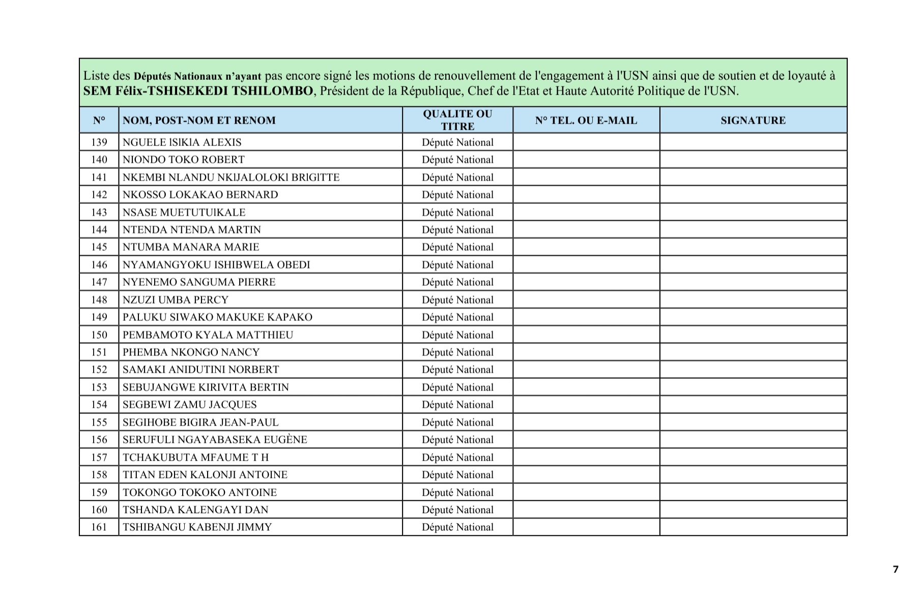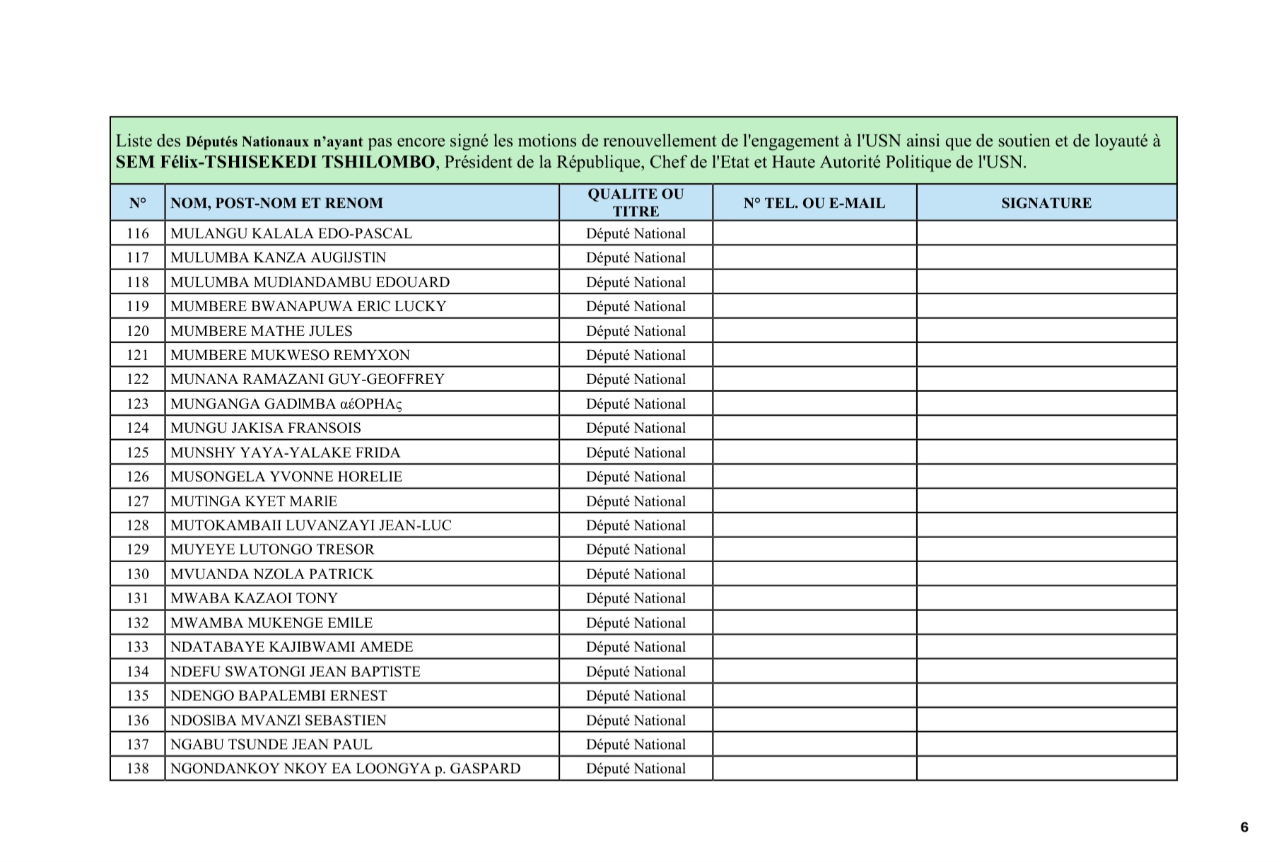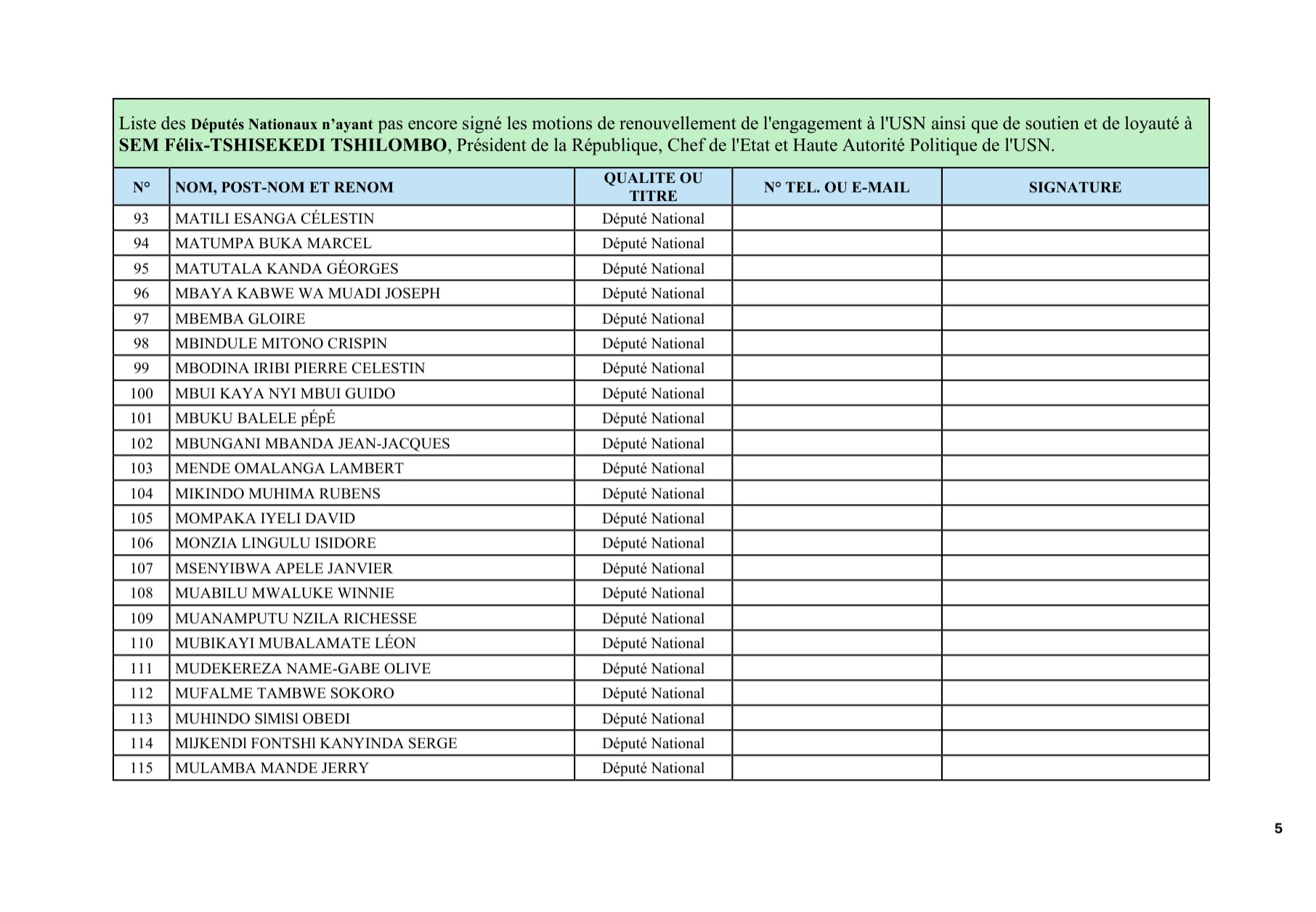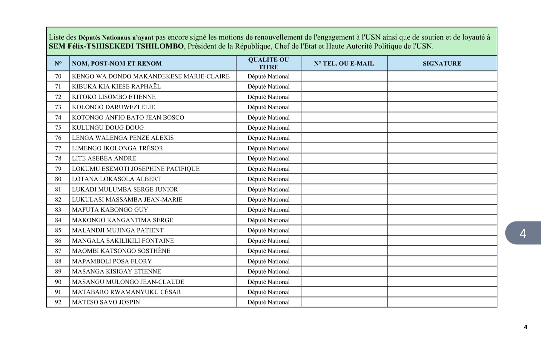 Le secrétaire général de l’Union sacrée de la Nation (USN) a dévoilé une liste comprenant 173 députés nationaux qui n’ont pas renouvelé leur loyauté envers le président Félix Tshisekedi. Cette liste inclut des figures éminentes de l’Union pour la Démocratie et le Progrès Social (UDPS), telles qu’Augustin Kabuya et Amisi Makutano, ainsi que d’anciens membres du Front Commun pour le Congo (FCC) comme Geneviève Inagosi, Lambert Mende et Chrispin Mbindule.