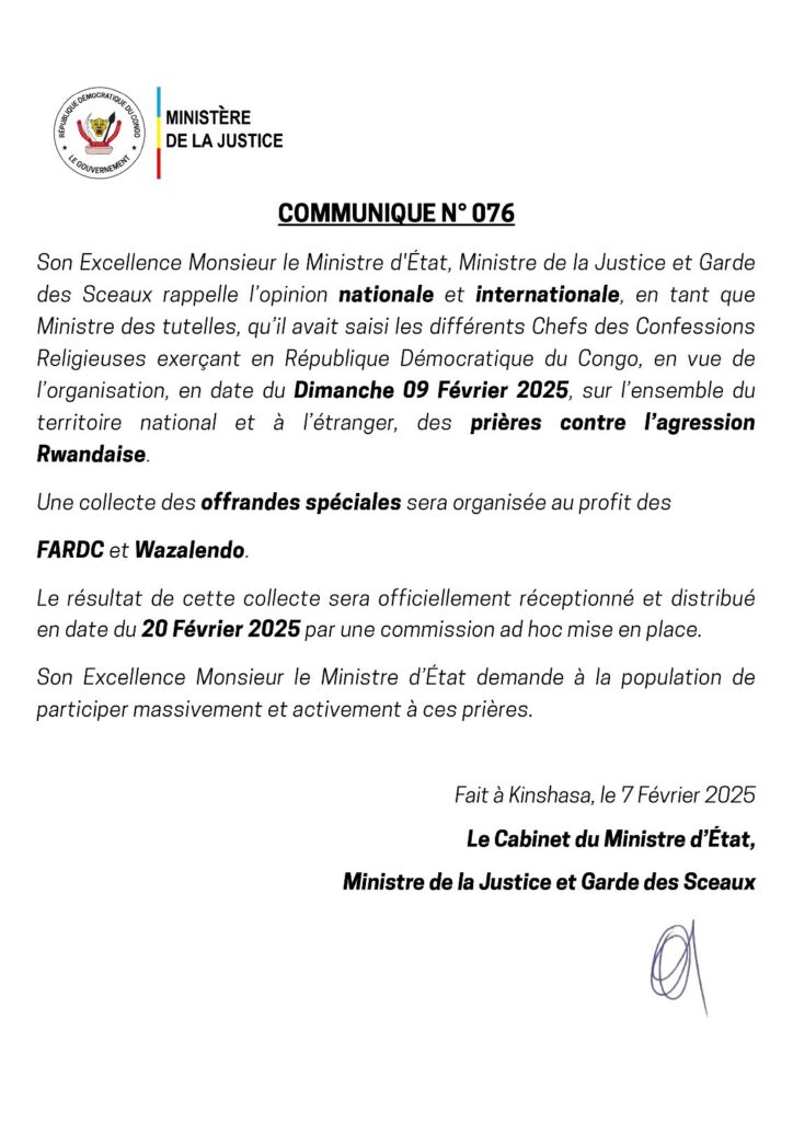Le gouvernement congolais appelle à une mobilisation nationale et internationale pour une journée de prières contre l’agression rwandaise. Dans un communiqué officiel, le Ministre d’État, Ministre de la Justice et Garde des Sceaux, a annoncé avoir sollicité l’implication des confessions religieuses opérant en République Démocratique du Congo pour organiser cet événement, prévu le dimanche 09 février 2025, sur l’ensemble du territoire et à l’étranger.